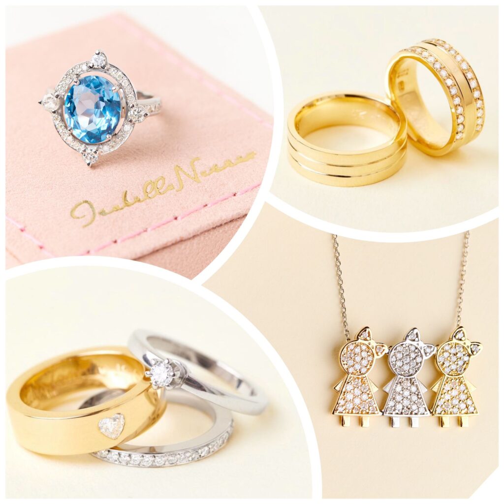 Isabella Nasser: As alianças sempre foram meu xodó, talvez por terem sido as primeiras peças que eu produzi ou por eu ter sido apaixonada pelo universo de casamentos, e também por todo o romantismo desse passo tão importante e por entender que se trata de uma joia que carrega um lindo significado de ser o lembrete diário de amor. Todos os dias meus clientes vão olhar para a mão e irão se lembrar do amor que nutrem pelo seu par. Tenho outras duas coleções que amo: a de signos, que são medalhas com moldura de diamantes e quatro pedras que representam seu signo e o símbolo no centro em alto relevo e a coleção Para Toda a Vida, que foi longamente elaborada, desenhada, redesenhada, com pingentes de menino e menina, totalmente cravados com diamantes e pedras coloridas preciosas.