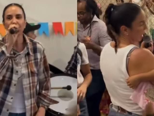 A famosa cantora pegou o microfone e cantou para os pais dos alunos na festa junina da escola das suas filhas. Inclusive, durante o pequeno show, ela pegou a herdeira de Lore Improta e Léo Santana, Liz, no colo.